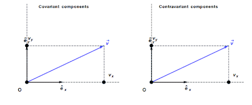 - Un vector o vector tangente, tiene componentes que contra-varían con respecto a un cambio de base, para compensarlo. Es decir, la matriz que transforma las componentes del vector debe ser la inversa de la matriz que transforma los vectores de la base. Se dice que las componentes de los vectores (a diferencia de las de los covectores) son contravariantes. Según la notación de Einstein (suma implícita sobre índice repetido), las componentes contravariantes se indican con superíndices (índices superiores), como en