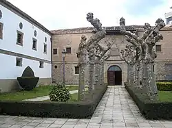 Destaca la portada del siglo XVII del pabellón NE.: puerta en arco de medio punto con cerco recto, bajo imposta que resuelve el cambio de material, de mampostería en el piso bajo a ladrillo visto en el alto. Sobre la puerta, se decora el paño superior encuadrando entre dos pilastras laterales - ligeramente resaltadas con motivos en esferas, pináculos y estrías - y el arco rebajado superior, un gran escudo bordeado de una molduración con motivos barrocos, volutas, dentículos, cordones, etc. muy libres y algo torpes e ingenuos, pero graciosos y efectivos. Al extremo de esta fachada, en el refuerzo de sillería, se ubica un escudo en ángulo.