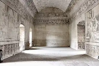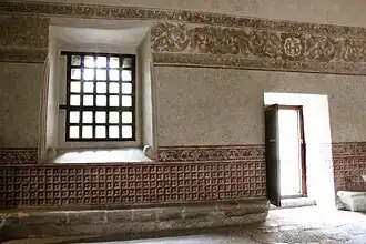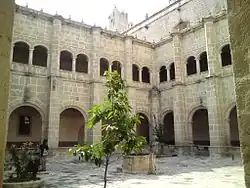El interior está conformado en su parte principal por un gran claustro cuadrangular de dos niveles, el cual se encuentra rodeado por corredores. El claustro en su primer nivel está conformado por 5 arcos de medio punto en cada uno de sus lados, alternados por gruesos contrafuertes. En su segundo nivel el claustro está conformado por un par de arcos de tres puntos sobre cada arco del primer nivel, siendo un total de 10 arcos de cada lado del claustro. Asimismo cada par de arcos también están alternados por contrafuertes que vienen del primer nivel.