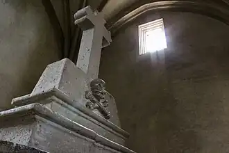 En la parte superior del nicho se ubica la talla en relieve de un águila bicéfala que hace referencia a la monarquía española de la Casa de Austria o Habsburgo. Sobre del águila se ubican los símbolos de un báculo y mitra. Toda la fachada es rematada por un triángulo a manera de frontón.