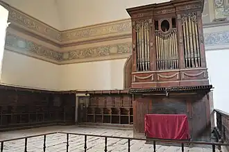 En el área del coro se ubica una sillería del coro donde anteriormente se situaban los frailes durante los oficios religiosos. Esta sillería presenta diseño barroco y fue mandada realizar por fray Francisco de Cantillana en 1689. Asimismo en este espacio se encuentra un órgano de fuelle de estilo barroco que data de 1750, el cual es uno de los órganos antiguos que se conservan en Michoacán.