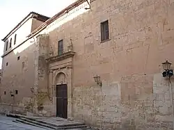 En la fachada del convento al recodo de San Benito se puede observar la puerta cegada de la antigua casa de Francisco Maldonado y, sobre las esbeltas dovelas de su dintel, los escudos nobiliarios de los Maldonado picados como Damnatio memoriae.