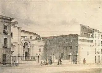![]() Fachada principal del convento de la Magdalena de la calle Atocha, según un dibujo de Avrial litografiado por Aznar en el siglo XIX. | ||
