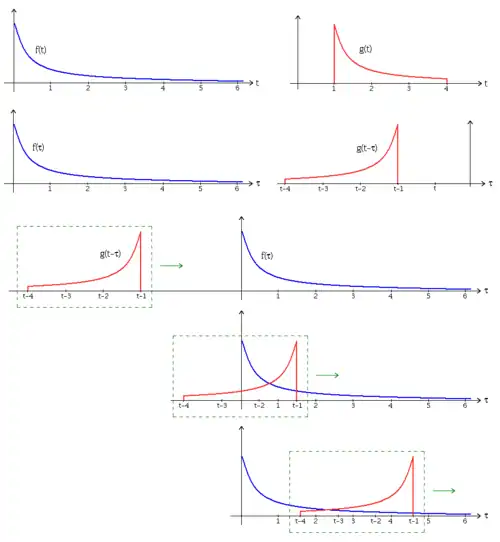 La convolución de y se denota . Se define como la integral del producto de ambas funciones después de desplazar una de ellas una distancia .