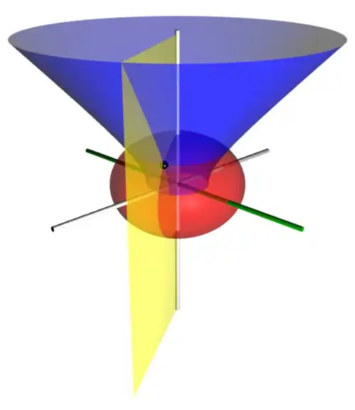 Figura 1: Isosuperficies de coordenadas para un punto P (mostrado como una esfera negra) en coordenadas esferoidales oblatas (μ, ν, φ). El eje z es vertical y los focos están en ±2. El esferoide oblato rojo (esfera aplanada) corresponde a μ= 1, mientras que el semihiperboloide azul corresponde a ν= 45°. El acimut φ= −60° mide el ángulo diedro entre el semiplano verde xz y el semiplano amarillo que incluye el punto P. Las coordenadas cartesianas de P son aproximadamente (1.09, −1.89, 1.66)