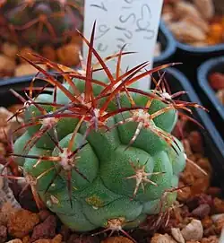 Presentan de 10 a 20 costillas romas o más o menos arqueadas, y están divididas en tubérculos, especialmente en especímenes jóvenes. Sobre ellas se asientan areolas convexas de 0,5 a 1 cm de diámetro. Están separadas unas de otras de 0,5 a 2 cm, y aunque inicialmente están cubiertas de lana corta, con el tiempo se vuelven desnudas. Tienen espinas que aunque inicialmente son de color negro, se vuelven grises con el tiempo. Entre ellas se distinguen de 0 a 3 espinas centrales gruesas de 3 a 6 cm de largo. También hay de 4 a 9 espinas radiales robustas, bastante delgadas o ligeramente curvadas, de 1 a 5 cm de largo.[3]
