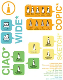 - Copic Wide: Se encuentran disponibles en 36 colores. Debido a su punta biselada y de gran tamaño (21 mm) son ideales para llenar de color espacios grandes y son apropiados para rotulación; se utilizan también para hacer caligrafía.