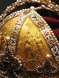 La mitra simboliza el ejercicio, por parte del emperador, del poder absoluto por derecho divino y su relevante posición espiritual, en su coronación era consagrado simbólicamente como diácono de la Iglesia católica. La mitra se encuentra dividida en dos permitiendo, como sucede en la Corona del Sacro Imperio, que en la parte central de la misma puedan colocarse dos diademas. Como las otras partes de la corona es de oro, está adornada con franjas esmaltadas en las que figuran aves y elementos vegetales. En la superficie de la mitra aparecen representadas cuatro escenas diferentes, las tres primeras aluden a los títulos más importantes de Rodolfo II, y la cuarta es una alegoría de un supuesto triunfo sobre los turcos. En la primera el monarca aparece arrodillado, en el momento de ser coronado Sacro Emperador Romano en Ratisbona. En la segunda, se encuentra cabalgado en la colina de la coronación en Bratislava durante la ceremonia de su entronización como rey de Hungría. En la tercera, Rodolfo II aparece representado durante la procesión por la ciudad de Praga, después de su coronación como rey de Bohemia. En la cuarta escena figura una representación alegórica de su victoria sobre los turcos, hecho que no posee suficiente base histórica.