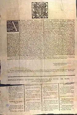 A partir de la rotura de la brecha el colapso de la defensa se precipitó. Los combatientes del baluarte de Levante, cogidos por la espalda, fueron pasados a bayoneta;[55] otro tanto les sucedió a los defensores del baluarte de Santa Clara, de los cuales sólo unas pocas compañías pudieron salvarse gracias a la carga suicida de una de las compañías de la coronela de Barcelona; y poco después también cayó el baluarte del Portal Nuevo, bajo las tropas españolas. Como recordaba el marqués de San Felipe «Todo se vencía a fuerza de sacrificada gente, que con el ardor de la pelea ya no daba cuartel, ni lo pedían los catalanes, sufriendo intrépidamente la muerte».[53] Los Consellers de Barcelona, viendo que toda la línea de defensa había colapsado y que la caída de la ciudad era inevitable, decidieron abandonar su cuartel general en el portal de San Antonio y salir a combatir por las calles. En ese momento recibieron aviso del teniente mariscal Antonio de Villarroel, quien les comunicaba que retomaba el general comando militar y les pedía que lanzaran su contrataque por el sector de San Pedro, mientras que él dirigiría otro por el centro. Pasadas las seis de la mañana, Rafael Casanova ordenó emitir el que sería su último bando como Conseller en Cap de Barcelona[57] ordenando sin excepción a todos los varones mayores de catorce años a la defensa de la ciudad de Barcelona y guardia de la bandera de Santa Eulalia, en servicio del Rey y de la Patria: