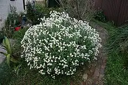 Florece entre junio y noviembre, con un máximo en septiembre.[6] Los capítulos, de 2,5 a 4,5 cm de diámetro presentan un disco central de color amarillo y brácteas blancas.[3] Los capítulos son solitarios o se disponen en cimas, según la subespecie.[4] El fruto es una cipsela cilíndrica, de 2–2,5 mm de largo, con pericarpio crustáceo, opaco, de color marrón rojizo oscuro, suave o salpicado con unos pocos idioblastos de 0,05 mm de longitud.[4] El vilano o papus está integrado por pelos filiformes pesistentes.