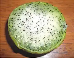 Los frutos son grandes, tienen forma redondeada y miden de 7 a 10 cm de diámetro. Son de color verde amarillento y tienen abundantes espinas que pierden al madurar. Contienen en su interior una pulpa jugosa con semillas ovales de color marrón.[2]