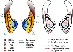 - ↑ Simon Baumann, Olivier Joly, Adrian Rees, Christopher I Petkov, Li Sun, Alexander Thiele, Timothy D Griffiths (2015). «The topography of frequency and time representation in primate auditory cortices». eLife 4: e03256. doi:10.7554/eLife.03256.