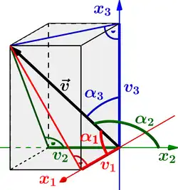 En cálculo vectorial, los cosenos directores de un vector en el espacio euclídeo son los valores del coseno de sus ángulos de dirección, es decir, el ángulo entre el vector y los tres vectores de base canónica , , .[1]