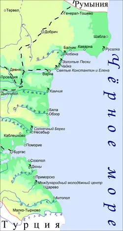 - Esta obra contiene una traducción derivada de «Bulgarian Black Sea Coast» de Wikipedia en inglés, publicada por sus editores bajo la Licencia de documentación libre de GNU y la Licencia Creative Commons Atribución-CompartirIgual 4.0 Internacional.