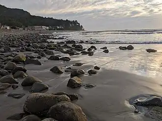 Las playas de Oregón son destinos populares para los visitantes turísticos. Montar a caballo, buscar almejas y hacer surf son actividades populares. Algunas playas son sede de eventos como el Torneo de Voleibol de Playa de Seaside, la meta de la carrera Hood to Coast, y la búsqueda de carrozas de vidrio de Lincoln City. Debido a los numerosos promontorios que hay a lo largo de la costa de Oregón, las playas varían en longitud desde decenas de millas hasta menos de un cuarto de milla. Aunque es menos común, la pesca de surf también se realiza en algunas secciones de la playa. No todas las playas de Oregón son playas de arena. Algunas playas también se están reduciendo, debido en parte a las interacciones humanas y en parte a especies de plantas invasoras como la hierba playera europea . [37]