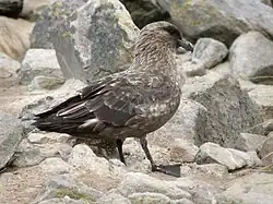 Otras especies de aves marinas que nidifican en estas costas son: el pingüino de penacho amarillo sudamericano, el petrel gigante del sur, el cormorán imperial, el cormorán de cuello negro, cormorán gris, el escasísimo cormorán guanay, el cormorán biguá,[27] el endémico pato vapor de cabeza blanca, el pato vapor volador, el pato juarjal, la garza bruja, el chorlito de doble collar, 3 especies de ostreros (el común, el negro y el austral), la amenazada gaviota cangrejera, la gaviota dominicana, la gaviota austral o gris,[28] el gaviotín sudamericano, el gaviotín pico amarillo, el gaviotín real, la skúa parda subantártico, etc.[29][30][31] Algunos sectores especiales en esta costa representan lugares claves que funcionan como estaciones intermedias de descanso y alimentación durante las enormes migraciones que todos los años emprenden las aves limícolas neárticas, como son los chorlos y playeros de las familias escolopácidos y carádridos, destacando los porcentajes poblacionales del playero rojizo (Calidris canutus), de la becasa de mar (Limosa haemastica), del playerito rabadilla blanca (Calidris fuscicollis), e importantes números de las poblaciones americanas del playero blanco (Calidris alba), del playero trinador (Numenius phaeopus), del vuelvepiedras (Arenaria interpres), etc.[32][33]