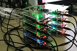 Cúmulo de ordenadores preparado para el entorno Hadoop, en el que se desarrollan aplicaciones para el tratamiento de grandes volúmenes de datos. La gestión y explotación de las ingentes cantidades de datos producidas por la sociedad de la información se considera[1]​ en 2018 uno de los mayores yacimientos de empleo.