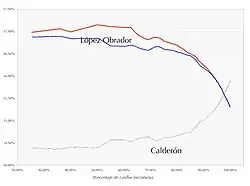 De acuerdo al sistema preliminar (PREP) del Instituto Federal Electoral, al contabilizarse el 70% de las casillas computadas, López Obrador se encontraba a favor con el 36.8% de la votación frente al 34.6% de Felipe Calderón. A partir de ese porcentaje, López Obrador empezó a caer de manera prácticamente simétrica a lo que empezaba a subir Calderón.[13]