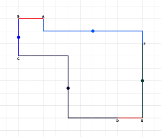 - Cada una de las partes del perímetro BC, CD, EF y FA es centrosimétrica, es decir, cada una es congruente consigo misma cuando se gira 180 grados alrededor de su punto medio.