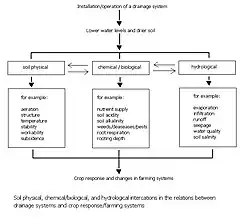 - El sistema de drenaje influye esa profundidad. La relación entre el diseño del sistema de drenaje y la profundidad del freático se puede describir con la ecuación de drenaje en la cual el requerimiento de drenaje se determina de un balance hídrico del suelo .[1]
