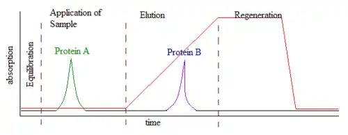 Las proteínas tienen numerosos grupos funcionales que tienen tanto cargas positivas como negativas. La cromatografía de intercambio iónico separa las proteínas de acuerdo con su carga neta, la cual depende de la composición de la fase móvil. Es posible separar varias moléculas de proteína ajustando el pH o la concentración de los iones de la fase móvil. Por ejemplo, si la proteína tiene una carga neta positiva con un pH de 7, entonces puede unirse a una columna cargada negativamente, mientras que una proteína con carga negativa no lo podría hacer. También podría eliminarse cambiando el pH para que la carga neta de la proteína fuera negativa.