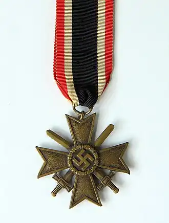 Estrechamente relacionada con la Cruz al Mérito de Guerra estaba la Medalla al Mérito de Guerra (en alemán: Kriegsverdienstmedaille), establecida el 19 de agosto de 1940 para los civiles que realizaran un servicio sobresaliente al esfuerzo de guerra.[10] Por lo general, se otorgaba a los trabajadores de las fábricas que excedían significativamente las cuotas de trabajo. La Medalla al Mérito de Guerra se otorgó a alemanes y no alemanes, a hombres y mujeres. Se estima que se entregaron 4,9 millones de medallas al final de la guerra en Europa.[10]