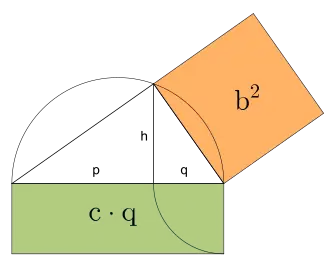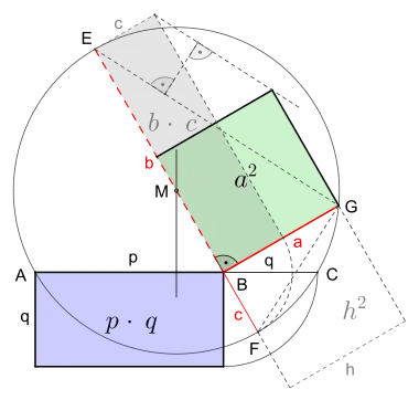 Independientemente de las proporciones del rectángulo dado (aquí, en color verde), se asume que un lado es la sección de la hipotenusa p y el otro lado es la sección de la hipotenusa q de un triángulo rectángulo. Luego, se pivota el lado más corto del ángulo recto y se obtiene la base de un triángulo rectángulo. Sobre esta base se aplica el teorema de Tales. La extensión del lado más corto del triángulo rectángulo interseca la circunferencia de Tales y proporciona la altura del triángulo rectángulo con las secciones de hipotenusa p y q. Si ahora se construye un cuadrado (aquí naranja) por encima de esta altura, entonces tiene exactamente la misma área que el rectángulo dado.