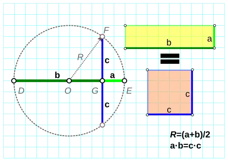 si se extrae la raíz cuadrada de esta expresión, la longitud del lado a del cuadrado es igual a la media geométrica de la longitud[3] p+q, y por lo tanto: