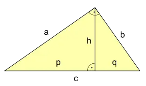 Sean a y b los catetos de un triángulo rectángulo y sea c su hipotenusa. Sea h la altura perpendicular al lado c, y sean p y q las dos secciones en las que divide la hipotenusa. Entonces se aplican las siguientes relaciones: