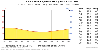 La Cuenca de la Quebrada de Vítor presenta un clima predominantemente árido, con temperaturas que varían considerablemente según la altitud y la proximidad al océano Pacífico.[8] Las temperaturas máximas estivales oscilan entre 26 y 30 °C, mientras que las mínimas invernales pueden caer por debajo de 0 °C en las zonas más altas. Las precipitaciones anuales son muy escasas, generalmente menores a 5 mm en la mayoría del territorio, aunque aumentan en las zonas de mayor altitud.[9] Este clima se caracteriza por un alto déficit hídrico, reflejando la aridez extrema de la región.[8]