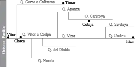Sus aguas provienen de la sierra a que pertenecen el cerro Orcotunco (5000 m s. n. m.) y el cerro Anocarire (5050 m s. n. m.).[6]: 117 Esta cuenca se inicia por el este en la sierra que forman los cerros Orcotunco y Anocarire, dando origen a varias quebradas que se unen en la localidad de Umirpa desde donde comienza a ser llamada quebrada de Vítor.[6]: 118 Solamente en la cuenca alta existe un flujo superficial de agua permanente, que normalmente no alcanza hasta la costa, salvo en los años con invierno altiplánico extremadamente lluvioso; por esta razón, en la costa solo se obtiene agua desde excavaciones de pozos.