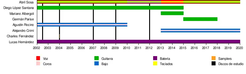 - Abril Sosa - Voz (2002 a la actualidad), Teclados (2002 a la actualidad, excepto en Misantropía), Guitarra (2002 a 2010, 2015 la actualidad), Bajo (2010 a 2013)