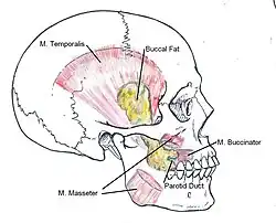 ![]() Diagrama del cuerpo adiposo de la mejilla en el que se representa su cuerpo y las extensiones temporal, bucal y pterigoidea. | ||