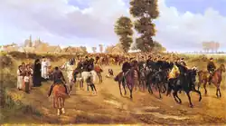 La batalla de Leipzig (16-19 de octubre de 1813) fue una de las mayores de la Era Napoleónica. El ejército napoleónico contaba con 195 000 hombres mientras que la coalición aliada llegó a reunir más de 250 000. Tras varios días de combate, Napoleón asumió que no podía defender su posición por lo que decidió retirar a sus fuerzas. El día 19 comenzó la retirada pero mientras aún un gran número de tropas se encontraba en Leipzig se minó por error el puente sobre el río Elster, quedando miles de soldados atrapados en Leipzig.[38] Algunos trataron de cruzar el río a nado y muchos de ellos perecieron ahogados. Entre ellos se encontraba Józef Antoni Poniatowski, quien doce horas antes había sido nombrado mariscal de campo por el mismo Napoleón.[39]