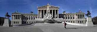 Parlamento de Austria de la Viena.Influencia grecobizantina: fue muy fuerte en las ciudades mercantiles italianas (que a menudo tienen relaciones comerciales con Grecia), y se refleja sobre todo en la arquitectura; Italia será pionera en el redescubrimiento del arte de la antigua Grecia, que tuvo lugar desde el siglo XIII, dos o tres siglos antes que en otros países europeos); en los países eslavos, la evangelización por los bizantinos fue acompañada por la propagación de la arquitectura griega y de motivos pictóricos griegos)