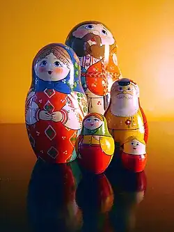 Una muñeca Matrioshka (en ruso: матрёшка) es una clase de juguete contenedor. Un conjunto de muñecas Matrioshka consiste en una figura de madera que puede ser separada en piezas para descubrir otra figura del mismo tipo en el interior, repitiendo el procedimiento con la resultante y así sucesivamente. El número de figurillas anidadas es regularmente de seis o más. Su forma es generalmente cilíndrica, redondeada en la parte superior y achatada en la base, estas muñecas no tienen extremidades (excepto aquellas en las que vienen pintadas). Cada muñeca es matizada manualmente y sus diseños pueden ser sumamente elaborados. Los modelos son ordinariamente sobre representaciones de campesinas con trajes típicos rusos, pero pueden ser también por ejemplo, sobre cuentos de hadas o líderes soviéticos y rusos.