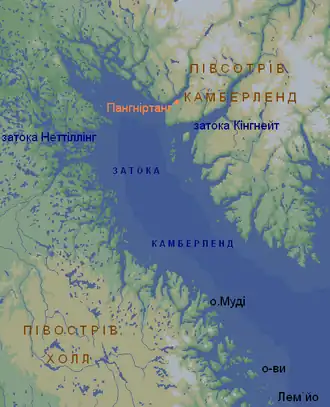 - ↑ Es difícil precisar el comienzo del Cumberland Sound en su parte sur, ya que la costa no presenta un punto claro en el que pueda señalarse el inicio. Se toma como tal punto el que muestra «The Atlas of Canada», disponible en: http://atlas.nrcan.gc.ca (enlace roto disponible en Internet Archive; véase el historial, la primera versión y la última). (Consulta realizada el 2 de septiembre de 2008).