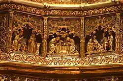 El basamento original se encuentra estructurado en pequeñas capillas separadas por agujas con dieciocho escenas de la vida de Cristo, de la Anunciación a la aparición a santo Tomás, de apenas 55 milímetros. El templete del viril se asienta sobre una base hexagonal con escenas que conforman la Adoración de los Reyes Magos. En lo más alto encontramos una figura de Cristo resucitado y triunfante.[1]