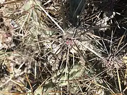 Las flores se abren durante el día (diurnas) y son polinizadas por abejas. Los frutos son de color verde a verde grisáceo y están comprimidos verticalmente. Son carnosos, espinosos y miden de 1,7 a 2,4 cm de largo, con diámetros de 3 a 3,6 cm. Tienen el ápice hundido hasta 1,1 cm de profundidad y presentan de 24 a 30 areolas.[2]