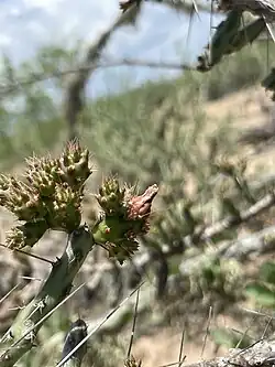 Los brotes son articulados, tienen tubérculos alargados y están formados por segmentos que se desprenden con facilidad. Cada uno de ellos mide de 1,5 a 9 cm de largo y de 0,4 a 0,8 cm de diámetro. Tienen forma cilíndrica, son muy delgados y tienen la epidermis de color verde a verde grisáceo, llegado a adquirir tonos púrpura alrededor de las areolas.[3]
