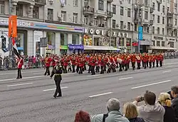Después de la tradicional ofrenda floral, las celebraciones continúan con una procesión a lo largo de la céntrica Calle Tverskaya y finalizan en el Kremlin. La calle Tverskaya tradicionalmente se transforma en una zona peatonal. El desfile generalmente incluye varias bandas de marcha académicas y militares nacionales. Otro evento tradicional es el Festival de música militar de la Torre Spasskaya, que tiene lugar entre el 26 de agosto y el 3 de septiembre en la Plaza Roja. en dicho festival suelen participar un gran número de bandas militares tanto nacionales como extranjeras. Así en el año 2011 participaron bandas procedente de Rusia, Austria, Armenia, Bielorrusia, Egipto, India, Italia, Kazajistán, China, Turquía, Uzbekistán, Suiza y Chile. Además los músicos suelen ofrecer funciones en diferentes parques de Moscú.[11]