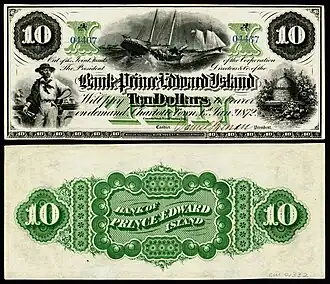 El Banco de la Isla del Príncipe Eduardo emitió papel moneda para la ínsula con fecha del 1 de enero de 1871 de varias denominaciones: 1, 2, 5, 10 y 20 dólares.[3]