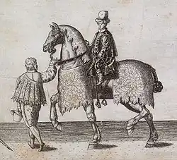 ![]() Daniel Bacheler a caballo, según un grabado de Thomas Lant en el funeral de Sir Philip Sidney en 1586. | ||