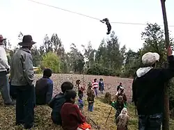 Los awqa, con su música de percusión algo marcial, van bajando para el 'cruce del río' o «waru tsinpay»; de igual modo, las bailarinas, con su música y canto melodioso y presentidor de encuentros inciertos, se aproximan al sitio donde darán la bienvenida a los extraños, de allende las serranías y las frondas. Se ha tendido un cable de nailon de 50 m de largo a una altura de 20 m, atados sus cabos a sendos altos eucaliptos.