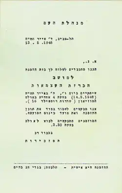 El 12 de mayo de 1948, el Minhelet HaAm (Gobierno provisional de Israel) fue convocado para votar sobre la declaración de independencia. Tres de los trece miembros estaban desaparecidos, con Yehuda Leib Maimon y Yitzhak Gruenbaum bloqueados en la sitiada Jerusalén, mientras que Yitzhak-Meir Levin estaba en los Estados Unidos.