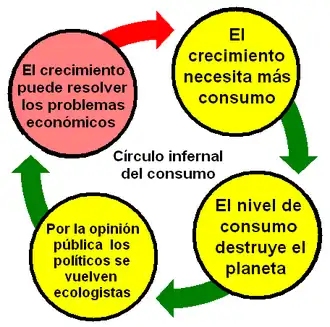 El decrecimiento rechaza el objetivo de crecimiento económico en sí del liberalismo y el productivismo;[7] en palabras de Serge Latouche: