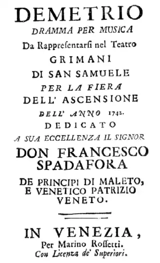 - ↑ Metastasio, Pietro (1751). Demetrio. Ed. Lorenzo Francisco Mojados. Madrid.