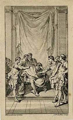 Según una tradición originaria de Polibio, probablemente idealizada y retomada por Tito Livio,[5] Filipo se dio cuenta de que la carta que incriminaba a Demetrio era una falsificación y, presa del remordimiento, nombró sucesor a un primo suyo llamado Antígono antes de morir al año siguiente.