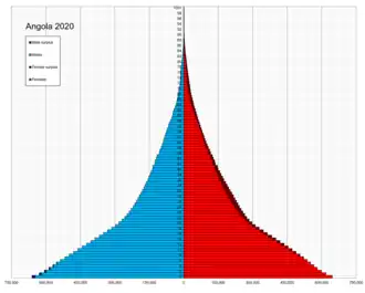 Al año 2021, Angola tiene una población de 34 503 774 habitantes.[1] La esperanza de vida es de 61,49 años.[2] Angola posee seis grupos étnicos bien definidos, de punto de vista lingüístico, hablantes todos de la lengua bantú: ovimbundu 37 %, kimbundu 25 %, bakongo 13 %, tucokwe 13 %, vangangela 9 %, vanyaneka 5 %. La lengua umbundu es la que predomina por el número de hablantes.