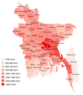 A excepción de países muy pequeños tales como Singapur y Mónaco, Bangladés es el país más densamente poblado en el mundo. La nación, con 912 personas por kilómetro cuadrado, ha sido a menudo comparada con la isla de Java (Indonesia). El país padece una alta superpoblación. En 1992, el gobierno comenzó a promocionar el control natal para frenar el crecimiento de la población, pero con poco éxito. Muchas personas no tienen posesiones o están obligados a vivir en regiones pantanosas peligrosas, con el riesgo de contraer enfermedades. La difícil situación del país ha provocado que muchos bengalíes emigraran a países más prósperos en búsqueda de mejores condiciones de vida, siendo el Reino Unido el destino principal, seguido de otros como Emiratos Árabes Unidos, Estados Unidos y Canadá.